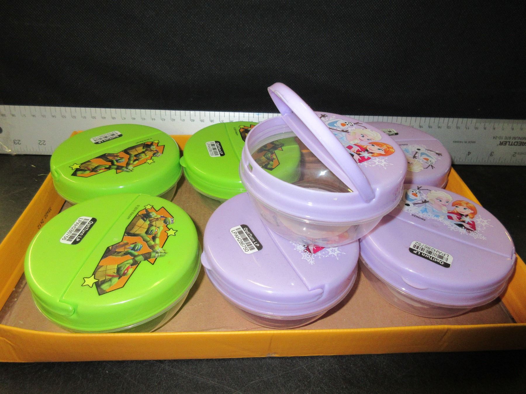 Flat of 7 New Flip Top Snack Containers / great for lunches etc.