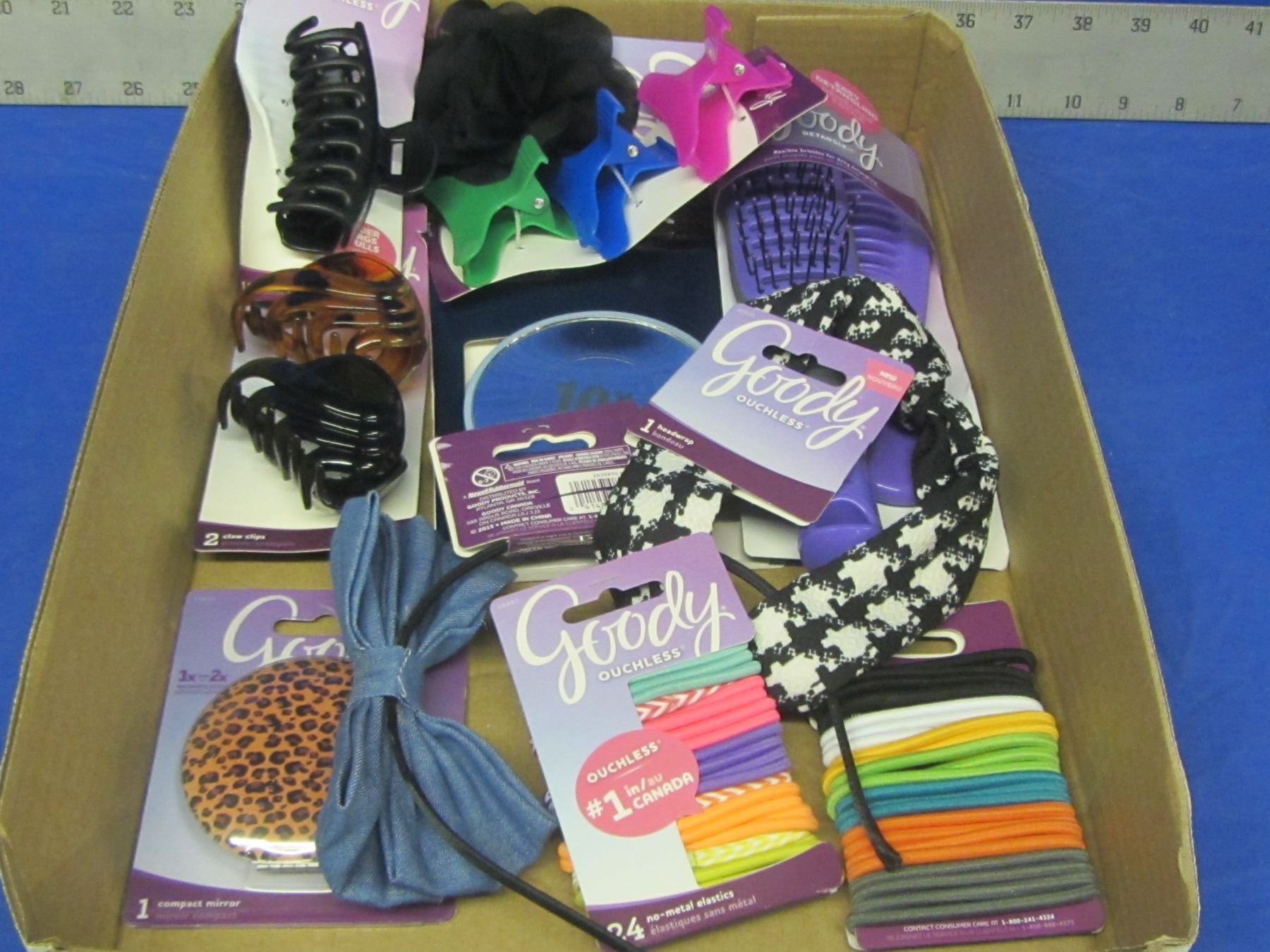 Flat of Goody hair products/ brush/hair elastics/clips/headwrap etc.
