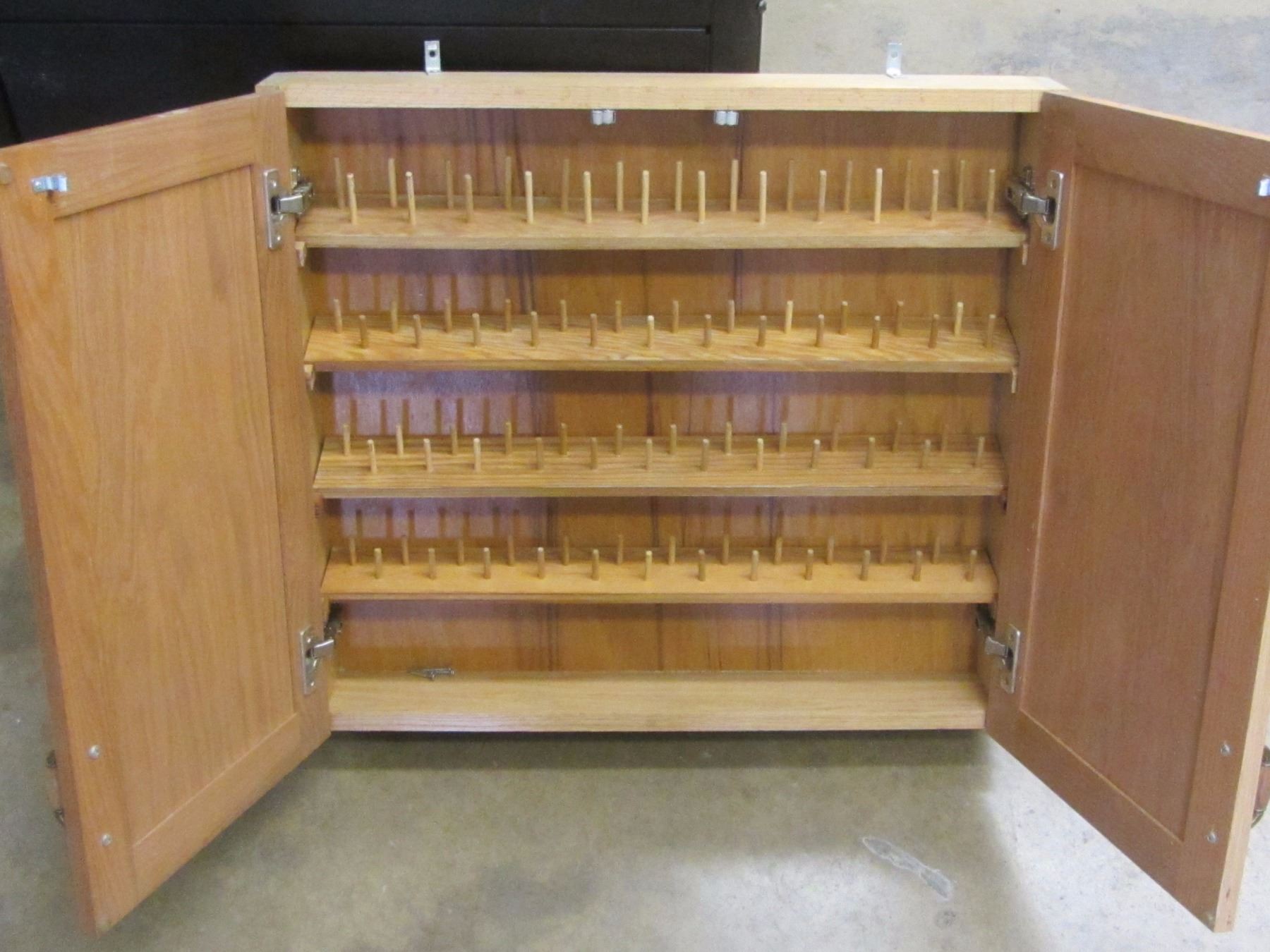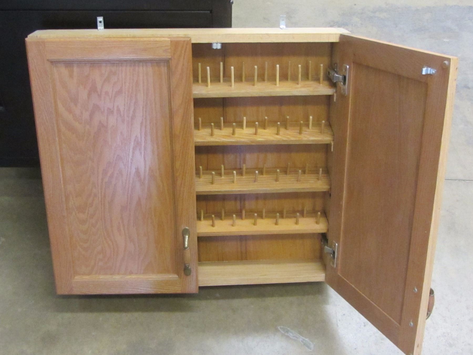 2 door solid oak holds 96 spools with bottom storage 24 x 27 "